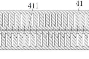 本实用新型涉及橡胶制品生产设备技术领域,特别是涉及一种橡胶制品冷却生产设备,通过冷水泵将冷却水泵至喷头处喷向橡胶制品进行全面冷却降温,冷却完成后通过传送带传送至吹风口处进行热风干燥,整体冷却过程操作简单,自动化程度高,冷却效率较高,冷却过程中产生的废水通过过滤箱过滤后回到冷水箱进行循环使用,有效节约水资源;包括冷却箱、底柱、进料口、出料口和传送带,冷却箱的内部设置有内腔;还包括底板、冷水箱、制冷装置、冷水泵、进水管、两组上布水管、两组下布水管、多组喷头、上隔板、下隔板、热风机、进风管、上布风管、下布风管、多组吹风口、废水管、过滤箱、过滤筒、回水泵和回水管。